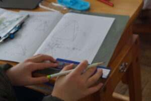 先日の二等辺三角形に続いて、今日は正三角形を描く練習をしました。