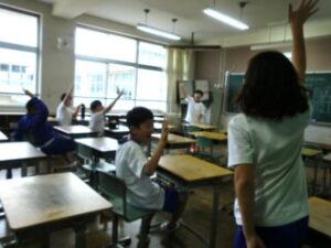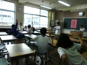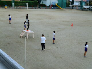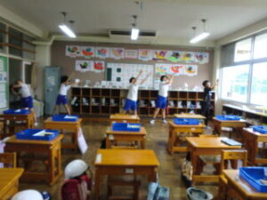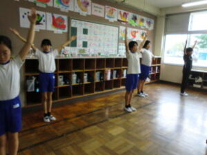 話しあいの後、前に立ってのラジオ体操の練習、運動会での動きの確認をしていました。