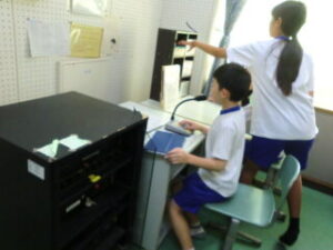 当番を決めた後、放送室で器機の使い方を確認していました。