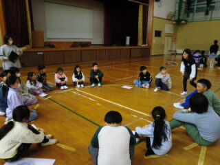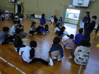 そのあとは6つの班の分かれて自己紹介し、遠足でする遊びを6年生が説明してくれました。