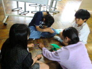 5年教室では図書委員会のチラシを仕上げていました。学習室ではいろんな学年の子が一緒に遊んでいます。