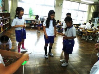 3年教室ではまたまたこま回し、4年教室ではみんながストレッチをしていました。