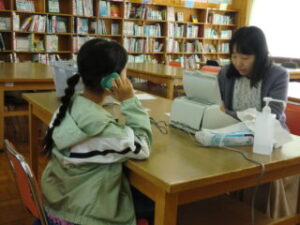 視力測定で、班ごとに読書室の前に並んで待っていました。全員が終わるまで学活です。係の仕事の掲示物を作っていました。
