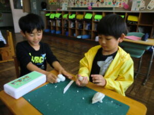 好きなものを描き終わり、粘土で好きなものを作っていました。後半にはペアで見せ合いをしていました。