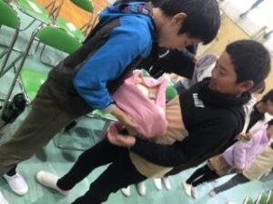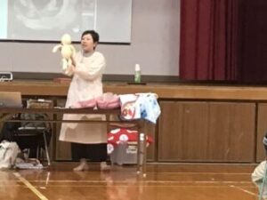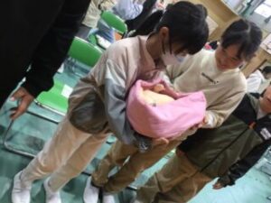 後半は妊婦さんのおなかの中の様子、へその緒胎盤も模型で紹介してもらいました。胎児をやさしく抱っこしてみます。