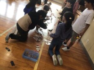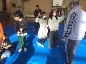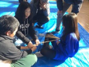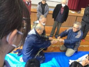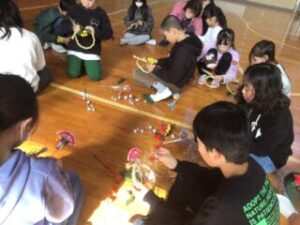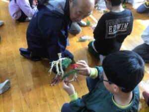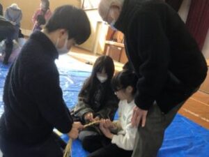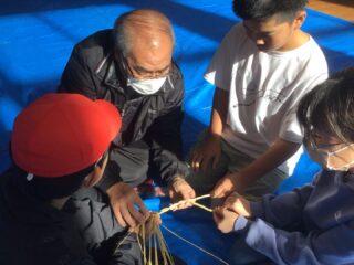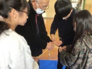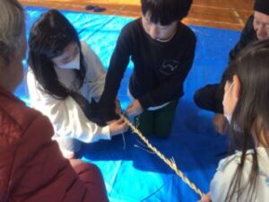 3・4限目に5年生が米作りの学習の一環として、自分たちで刈り取った稲の藁を使ってしめ縄作りをしました。