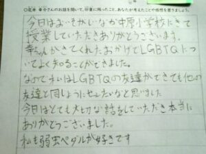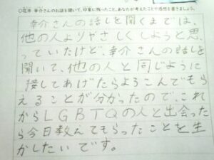 今回は性的思考・性自認に係る人権学習に、花井幸介さん(NPO法人HOME代表理事)に出前授業をしていただきました。