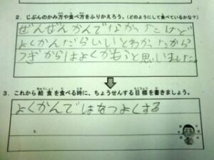 ①奥歯で、②食べ物が小さくなるまで30回くらいよくかんで、③床に足をつけていい姿勢でたべようね。