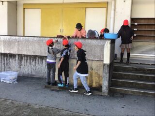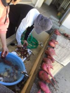 先生の話を聞いてから、班でたらいに分けられたいもを洗いました。