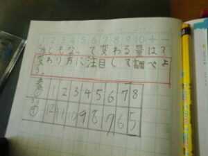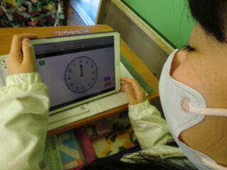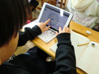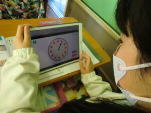 表(ひょう)に数字を記入します。サクサク進める4年生。アナログ時計が読めないと難しいですがさすがです。