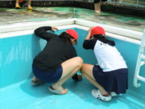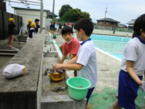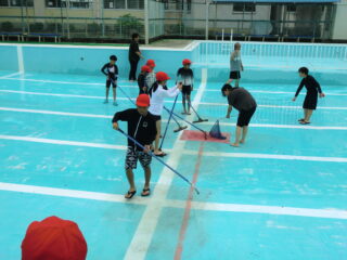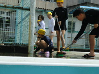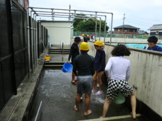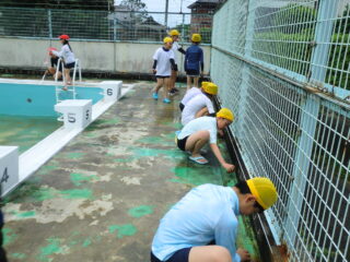 ホーム > 2025年度 / 学校活動の様子 R7〈4・5・6年〉プールそうじ 梅雨の晴れ間。予備日の今日にプールそうじができました。 給食後、始めました。 6年生は大小プール内、5年は側溝・プールサイド・シャワー・腰かけ場所。 4年生は更衣室と渡り廊下。丁寧に掃除してくれます。 壁をこすったあとは、バケツで水をかき出して、作業を早めます。 オタマジャクシも気をつけ、すくってはバケツに入れていました。 後半は5年生も6年生の場所を手伝いました。 どんどん水がはけ、プールもきれいになっていきます。 最後はごほうびのシャワー。 4・5・6年生が頑張ってくれたおかげで気持ちよく水泳ができそうです。ありがとう。 シェアする Twitter でシェア はてなブックマークに保存 LINE でシェア Facebook でシェア Pocket に保存 Feedly で購読 関連投稿 学校活動の様子 / 2022年度 校内研修会 学校活動の様子 / 2021年度 出前授業(2年生) 学校活動の様子 / 2022年度 着任式・始業式・入学式 学校活動の様子 / 2022年度 一日入学 2024年度 / 学校活動の様子 図書フェスティバル!!~4班の日~ 学校活動の様子 / 2023年度 4年 音楽 音符のおさらい!! 前の投稿 R7 〈児童会〉学校かくれんぼ 次の投稿 R7〈4年〉リサイクルセンター見学