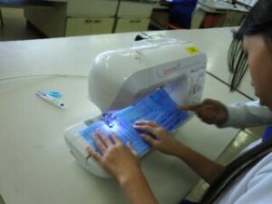 今回はミシン縫いが中心です。6月に引き続き、地域のかたに協力していただいています。