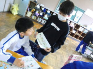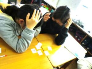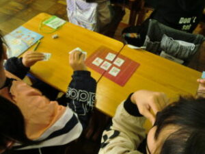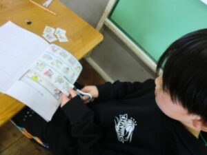巻末のカードを使って、2人組になり、ライ先生の言葉を聞いてそのカードを取ります。