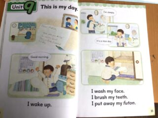 私の一日という単元で、起きる→顔を洗う→歯を磨く→布団をしまう‥‥→学校へ行く‥‥→すてきな夢を見る を英語で発音します。