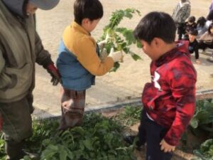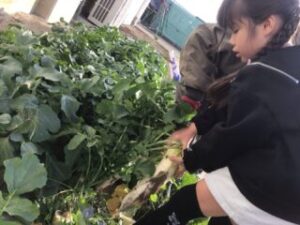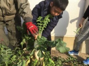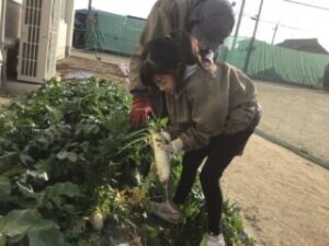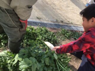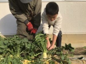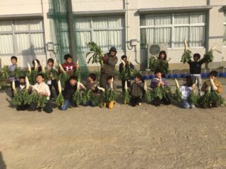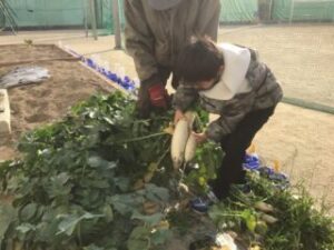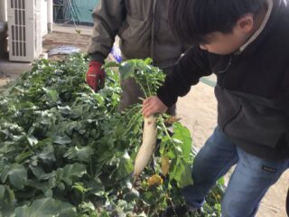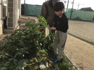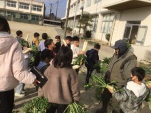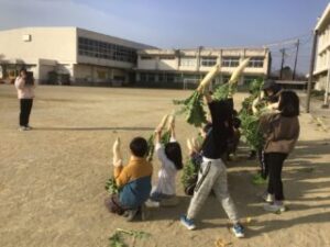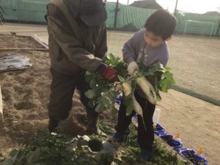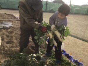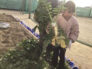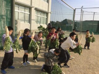 ホーム > 2025年度 / 学校活動の様子 R7年度〈2年〉大根の収穫Ⅱ 1限目に2年生が学級園のダイコンを収穫しました。 10月17日にタネを植えたので、ちょうど3か月後です。 7月に収穫したダイコンは小さめだったので、今回はどうかな? 再び越山さんにお世話になりました。 「よいしょ、よいしょ。」2回目もいきましょう。 期待通り大きなダイコンでうれしいですね。 「優等生(ゆうとうせい)」という品種です。 最後に記念撮影。(目線は隣のカメラに向いています。) こんなのもありました。 2年生は持ち帰ります。うれしい重さですね。 食べた感想も聞かせてくださいね。 越山さんご指導ありがとうございました。 シェアする Twitter でシェア はてなブックマークに保存 LINE でシェア Facebook でシェア Pocket に保存 Feedly で購読 関連投稿 学校活動の様子 / 2023年度 4年 タウンウオッチング!! 2024年度 / 学校活動の様子 5年 国語 印象に残ったところをまとめよう!! 2025年度 / 学校活動の様子 R7〈3・4年〉さつまいも洗い 学校活動の様子 / 2021年度 生理用品をあたりまえに 2024年度 / 学校活動の様子 運動会の練習 チラリとご紹介!!⑮ 学校活動の様子 / 2023年度 3年 体育 水泳がんばってます! 前の投稿 R7年度〈1・2年〉昔の遊び交流会 次の投稿 R7年度〈5年〉総合 おもちつき