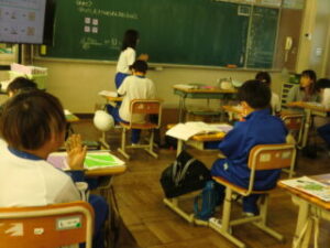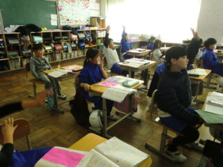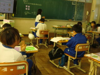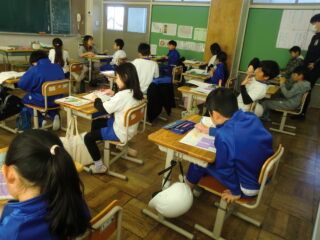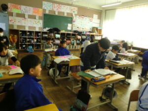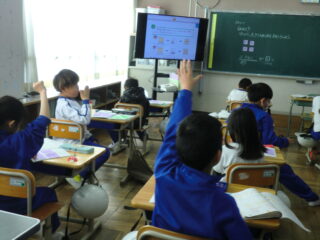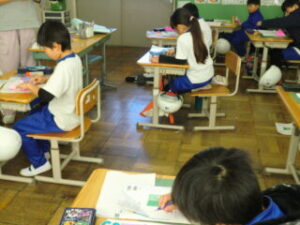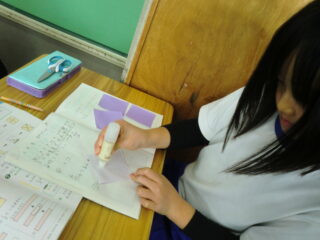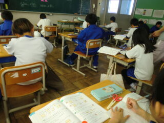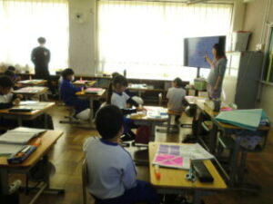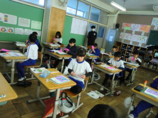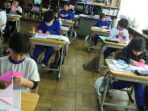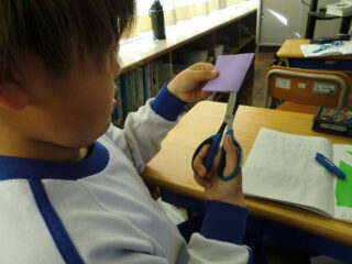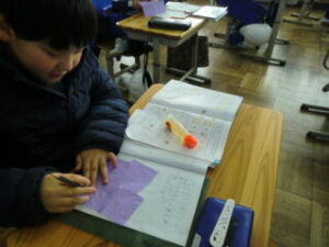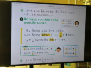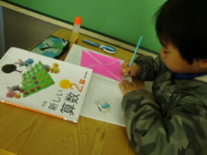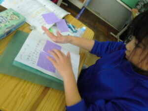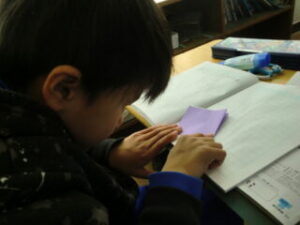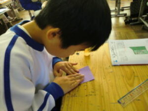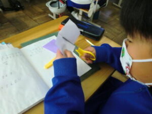 ホーム > 2025年度 / 学校活動の様子 R7年度〈2年〉算数 分数 2限目に2年生が正方形を半分に折って、それをまた半分に折る活動をしていました。 きっちり端を合わせて折り 線をはさみで切り、 4つの紙を重ねて同じ大きさになっていることを確かめた後、ノートに貼ります。 正方形が4つです。 他の折りかたでしてみます。 今度は直角三角形が4つです。 同じ大きさに4つに分けた1つ分をもとの大きさの四分の一といい、その表し方もわかりました。 集中して作業ができた2年生です。 次の時間からは少しずつ難しくなっていきますよ。 この調子でがんばろうね。 シェアする Twitter でシェア はてなブックマークに保存 LINE でシェア Facebook でシェア Pocket に保存 Feedly で購読 関連投稿 2025年度 / 学校活動の様子 R7 〈3年〉公民館の学習 学校活動の様子 / 2021年度 和食の日 学校活動の様子 / 2022年度 児童会・委員会 学校活動の様子 / 2022年度 ふうせんかずらの栽培(1年) 2024年度 / 学校活動の様子 2年 図工 じぶんいろのちょうちょ 学校活動の様子 / 2022年度 プール水泳(5年) 前の投稿 R7年度〈6年〉戦争体験を聞いて 次の投稿 R7年度〈1・3年〉読み聞かせ交流会