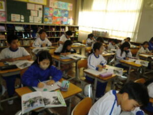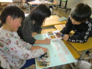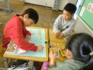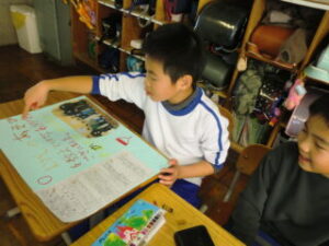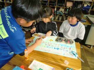 1年生の同じ班の子たちのメッセージも含んで、班で画用紙にまとめていました。