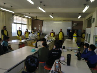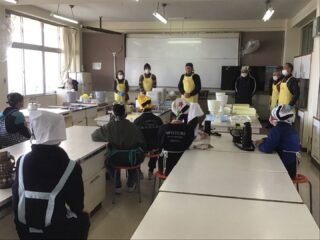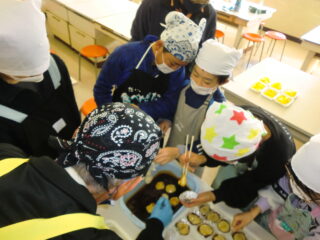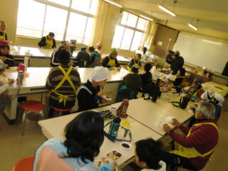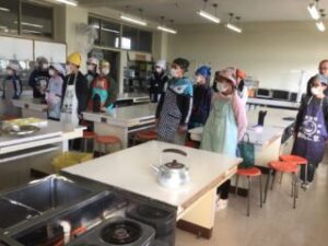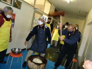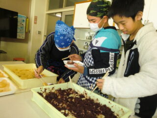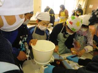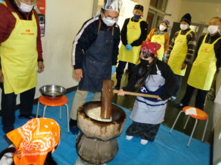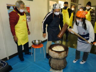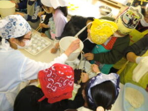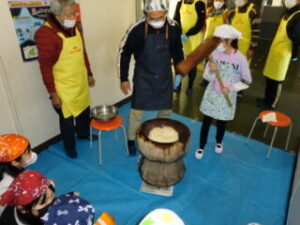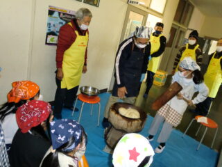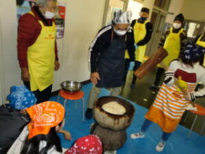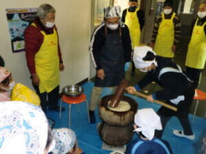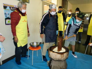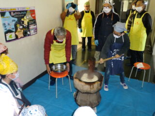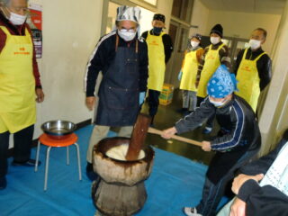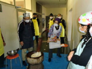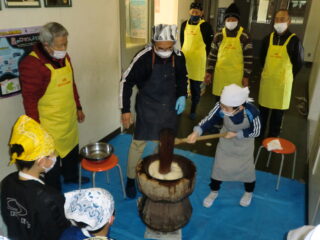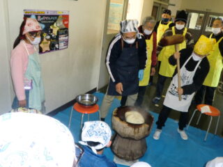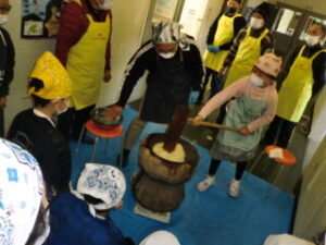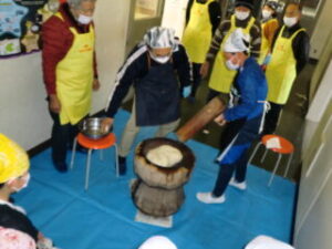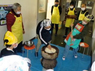 サンライズ嬉野さん、まちづくり協議会・公民館・文化センターの方々に来校いただき、おもちのつき方や、味付けのしかたを教えていただきました。