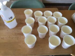 このあと、フッ化物洗口の練習をしました。今回は水を使います。