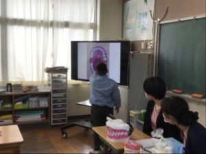 「この歯のどこがむし歯になっている歯かわかるかな?」何人かが前にでて、答えていました。