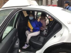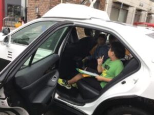子どもたちは後部座席から、車内のボタンや無線機をよく観察していました。